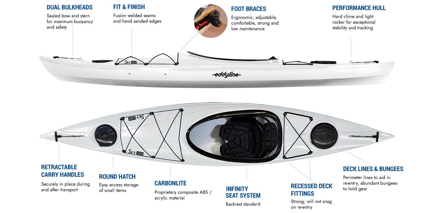 The Sky 120 blends the stability of a recreational kayak with the efficiency and tracking of a light touring design. At just 12 feet long and 41 pounds, it’s easy to transport, fun to paddle, and perfect for lakes, bays, and slow-moving rivers. Read more.