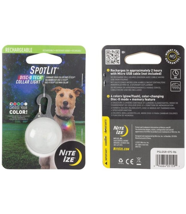 See Spot Run! The SpotLit Rechargeable Collar Light gives you the extra eye and peace-of-mind you need while your dog explores the outdoors, from the backyard to the dog park to the campsite. Simply clip the light onto virtually any collar and give it a push to bring it to life. Featuring a Disc-O Tech LED module, you can leave the light in color-changing Disc-O mode, letting the vivid colors cycle through, or select from 4 colors of red, green, blue, or white, setting any of them to glow or flash. Its built-in memory feature remembers your last color setting, automatically turning back on in that setting for the next night of fun. With rapid recharging in 2 hours via micro USB cable (not included), you can charge up to full brightness and return to more adventures with your furry sidekick in clear view.